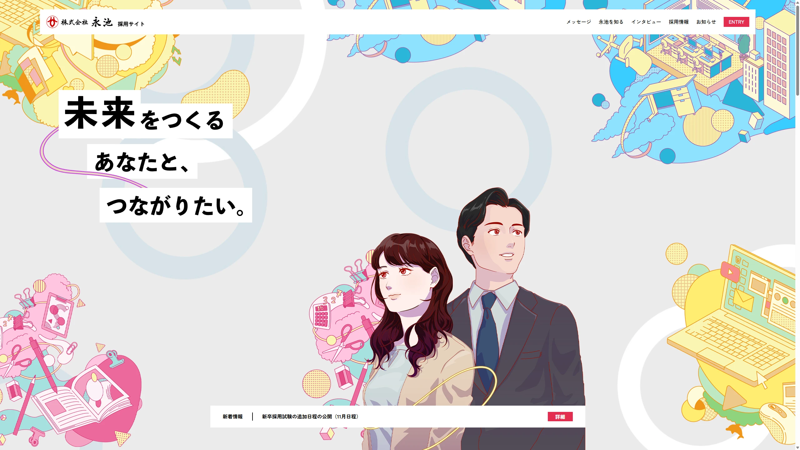 株式会社永池様は、佐賀県佐賀市に本社を構える、和用紙・文房具・オフィス家具・事務機器・園芸資材などを扱う総合卸商社です。今回、採用活動の強化を目的として、リクルートサイトを制作しました。永池様のテーマである「つなぐ」「つながる」を軸に、人を大切にする企業の魅力と未来への期待感を明るくポップなデザインで表現し、カラフルな配色やイラストで就活生がサイトを訪れた際にワクワクするようなトーンに仕上げました。また、硬くなりがちな企業データページには遊び心のあるMBTIデータを加えることでより親しみやすく。数字だけでは見えない会社の雰囲気をポップに表現しました。さらに、社員インタビューでは「私の推し商品」として、その社員が特に愛着を持つ商品を「推し」として紹介することで視覚的に印象付けながら、仕事のやりがいやサービスを自然に理解できる構成としています。